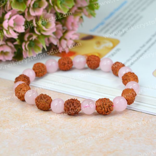 A rose quartz bracelet symbolizing love, compassion, and emotional healing. It is often worn to attract love, foster self-love, and promote harmony in relationships. The soft pink color adds a soothing and gentle energy to its wearer.