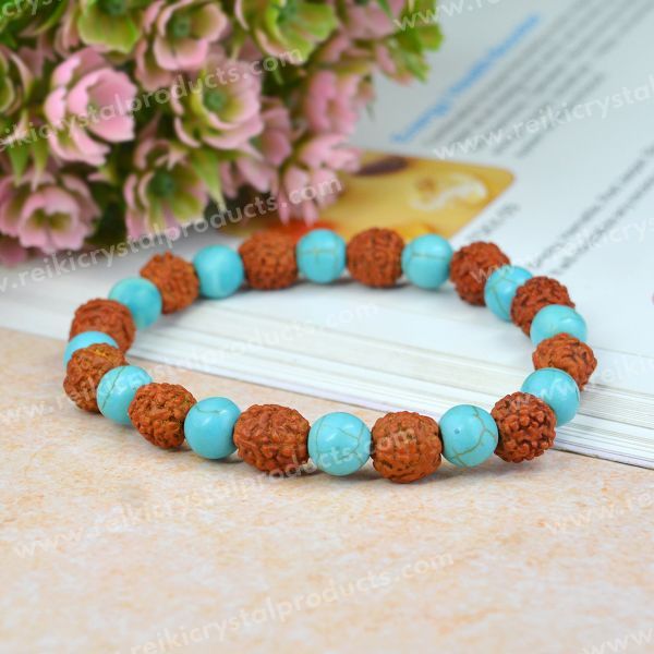 Stretchable Elastic Handmade Rudraksha with Synthetic Turquoise Bracelet | Diameter : 6.3 cm. | Stone Size – 8 mm | Shape - Round | Charged By Reiki Grand Master & Vastu Expert | Pack of 1 pc