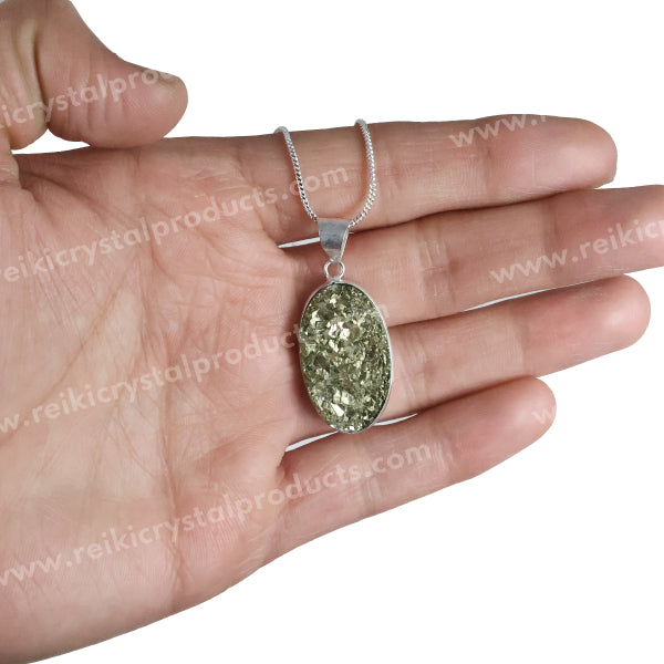 Natural Crystal / Stone AAA Quality Pyrite Oval Rough Pendant With Chain | Length : 4 cm | Width – 1.5 cm . Charged By Reiki Grand Master & Vastu Expert