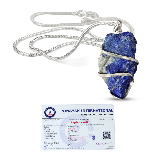 * A lapis lazuli pendant characterized by their deep blue color and golden flecks of pyrite. This stone is often associated with wisdom, truth, and self-expression, making it a powerful tool for enhancing communication and insight. Lapis lazuli is also believed to promote inner peace, stimulate intellectual ability, and encourage self-awareness, making it a popular choice for those seeking personal and spiritual growth.