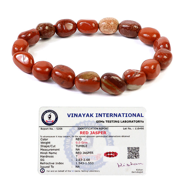 * Stretchable Elastic Handmade Natural Crystal Stone Tumble Bracelet | Diameter: 6.3 cm.* A red jasper bracelet is known for their vibrant, earthy red hue. This stone is often associated with vitality, strength, and grounding energy, promoting emotional stability and courage. Wearing a red jasper bracelet is believed to enhance creativity, motivation, and resilience, making it a great choice for those seeking to overcome challenges and boost their confidence.* Energized by Experienced Reiki Grandmaster.* The bracelet is made from Natural Stones so small holes, crack marks on the surface or inside the stones are often visible.