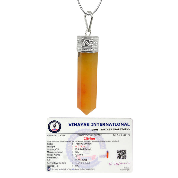 * Natural Crystal Stone Pendant | Length: 30-35 mm. | Width: 10-15 mm.* A citrine Pendant is known for their warm yellow to golden hues. Citrine is often associated with prosperity, abundance, and positivity, making it a popular choice for those looking to attract wealth and success. It's believed to enhance creativity, motivation, and confidence while promoting a cheerful and optimistic outlook.* Energized by Experienced Reiki Grandmaster.* The pendant is made from Natural Stones so small holes, crack marks on the surface or inside the stones are often visible.