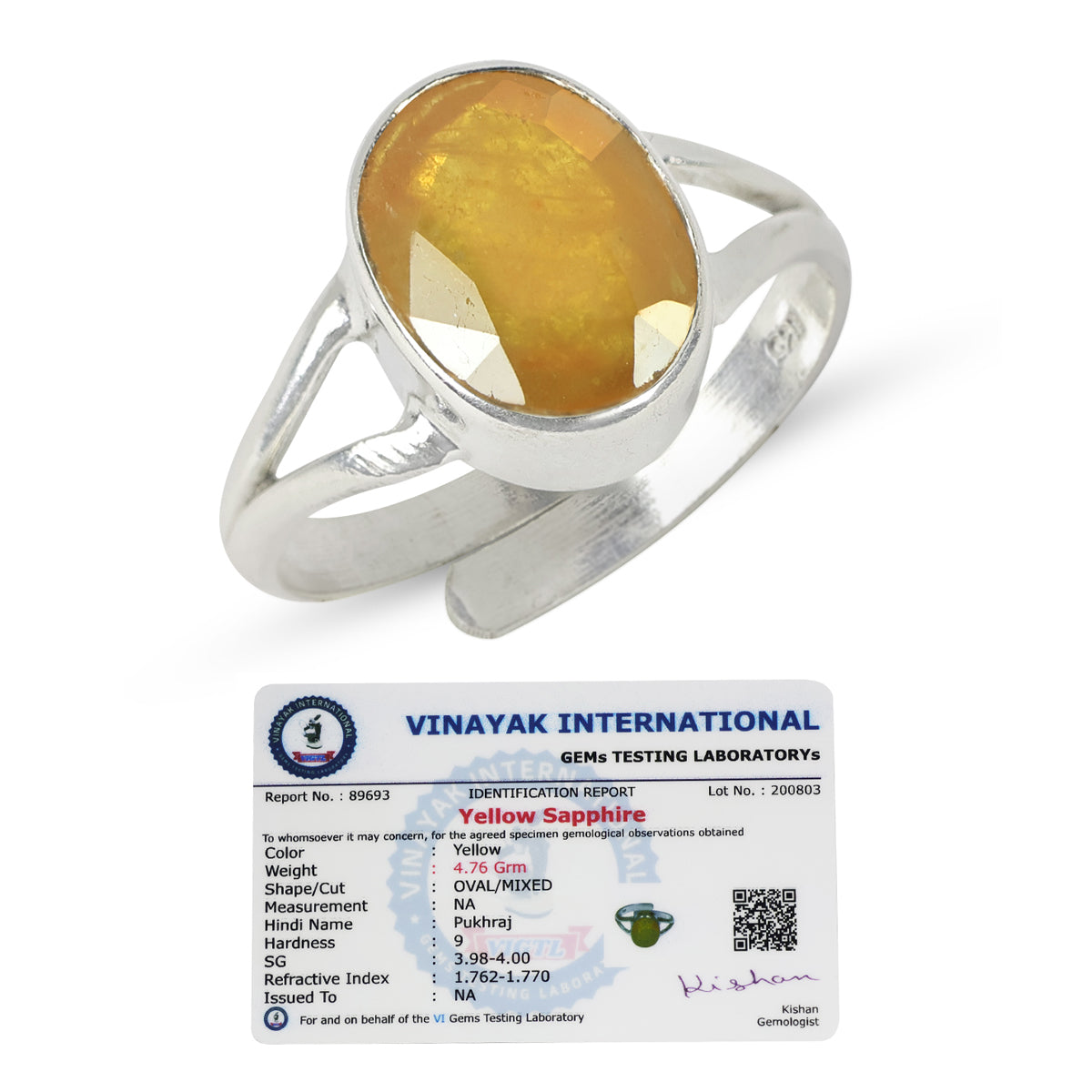 Pure Silver Setting: Crafted with pure silver, the setting of the ring exudes elegance and sophistication. The high-quality silver enhances the brilliance of the yellow sapphire, creating a captivating contrast that accentuates its natural beauty.