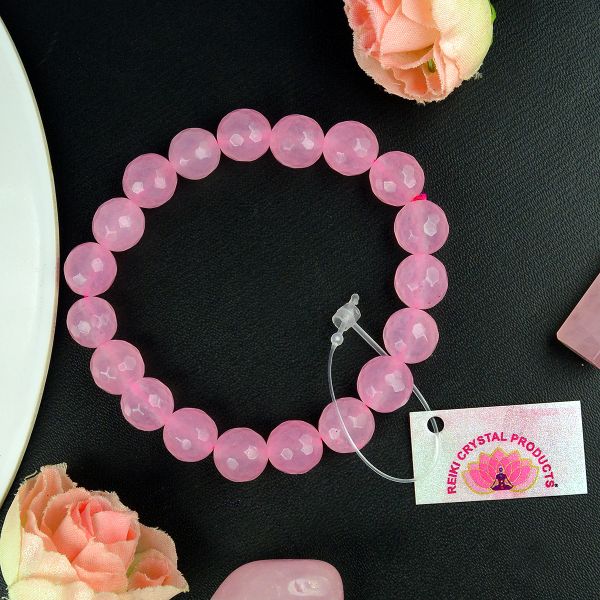 * A rose quartz bracelet symbolizing love, compassion, and emotional healing. It is often worn to attract love, foster self-love, and promote harmony in relationships. The soft pink color adds a soothing and gentle energy to its wearer.