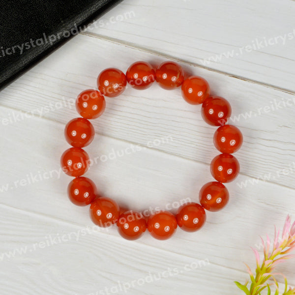 * A red onyx bracelet which features striking reddish hues and smooth surfaces. This stone is often associated with strength, courage, and passion. Wearing a red onyx bracelet is believed to boost energy levels, enhance motivation, and promote emotional resilience, making it a popular choice for those seeking to ignite their inner power. Its vibrant color adds a bold and dynamic touch to any jewelry collection.