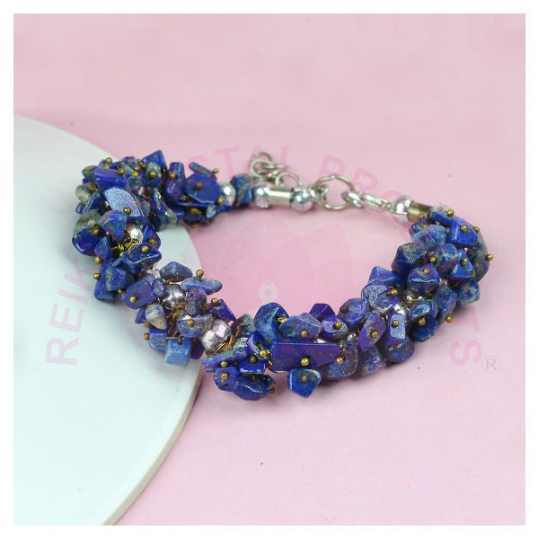 * A lapis lazuli bracelet characterized by their deep blue color and golden flecks of pyrite. This stone is often associated with wisdom, truth, and self-expression, making it a powerful tool for enhancing communication and insight. Lapis lazuli is also believed to promote inner peace, stimulate intellectual ability, and encourage self-awareness, making it a popular choice for those seeking personal and spiritual growth.