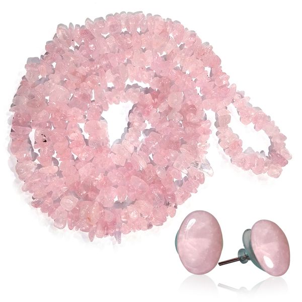 * Natural Handmade Crystal Stone Rose Quartz Chip Mala/Earring | Length: 81.2 cm. | Shape : Natural Beads.