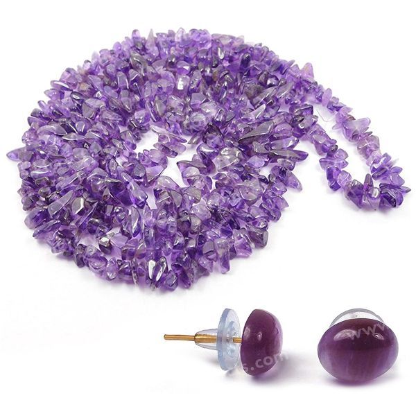 * Natural Handmade Crystal Stone Amethyst Chip Mala/Earring | Length: 81.2 cm. | Shape : Natural Beads.