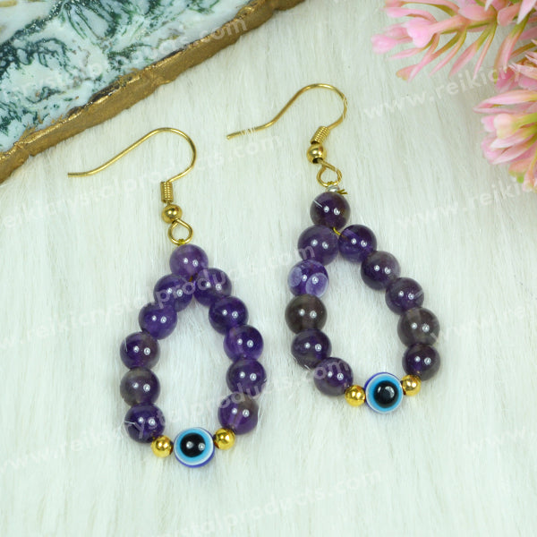 Natural Crystal / Stone Amethyst With Evil Eye Earring | Length : 5.5 cm | Width - 2.5 cm . Charged By Reiki Grand Master & Vastu Expert