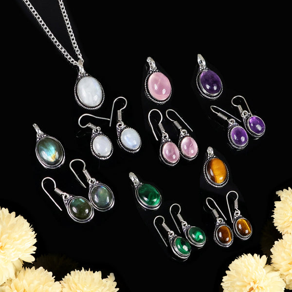 Adorn your nack and earr with the enchanting energies of our Labradorite Stone Pendant with Earring—an alluring accessory crafted with genuine Labradorite gemstones known for their mystical iridescence, spiritual insight, and transformative qualities.