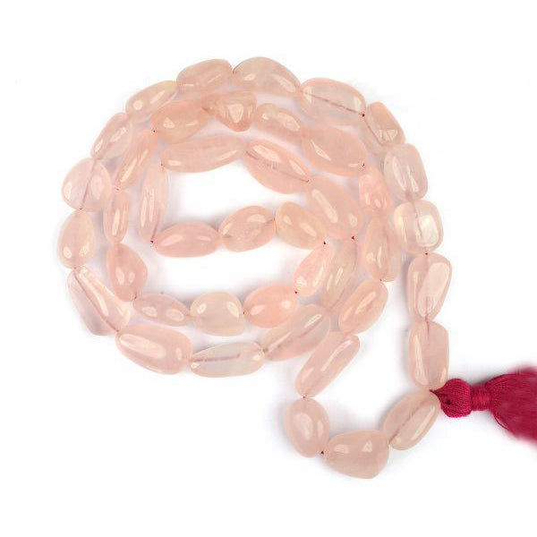 * A rose quartz mala symbolizing love, compassion, and emotional healing. It is often worn to attract love, foster self-love, and promote harmony in relationships. The soft pink color adds a soothing and gentle energy to its wearer.