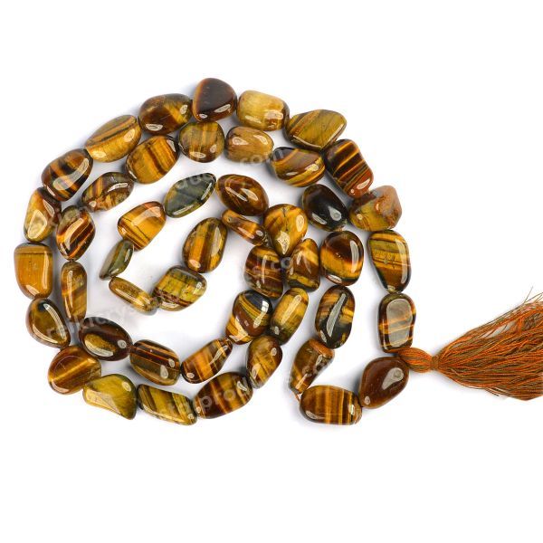 * A tiger eye mala is known for their striking golden to brown bands. This stone is often associated with protection, grounding, and clarity, promoting mental focus and confidence. Wearing a tiger's eye bracelet is believed to enhance courage, balance emotions, and attract good fortune while providing a shield against negative energies. Its unique, shimmering appearance adds a bold touch to any jewelry collection.