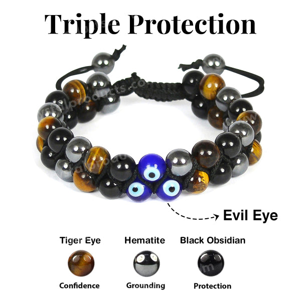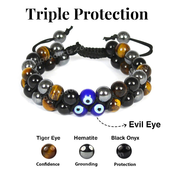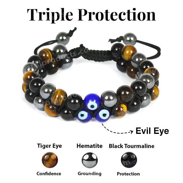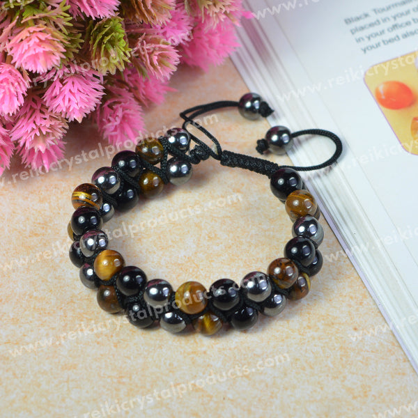 * A triple protection bracelet featuring black tourmaline, hematite, and tiger's eye combines the unique protective qualities of each stone: