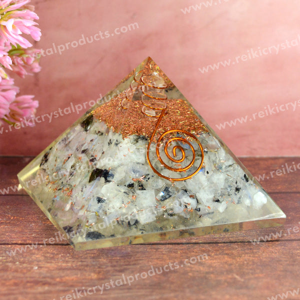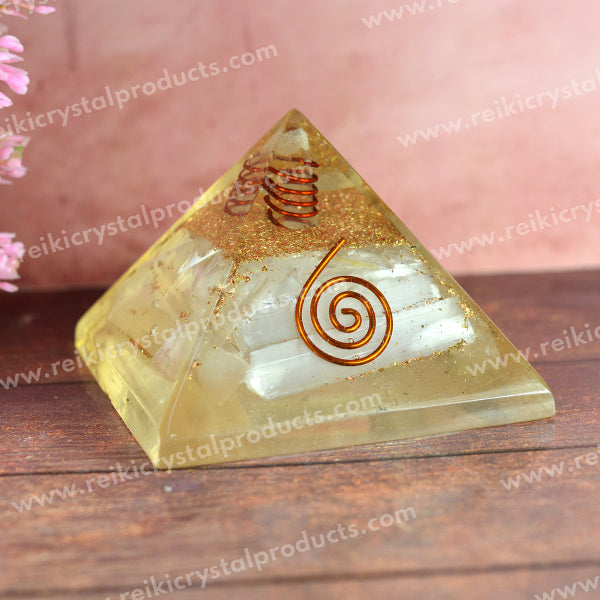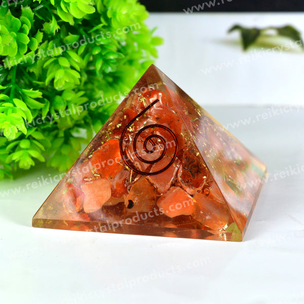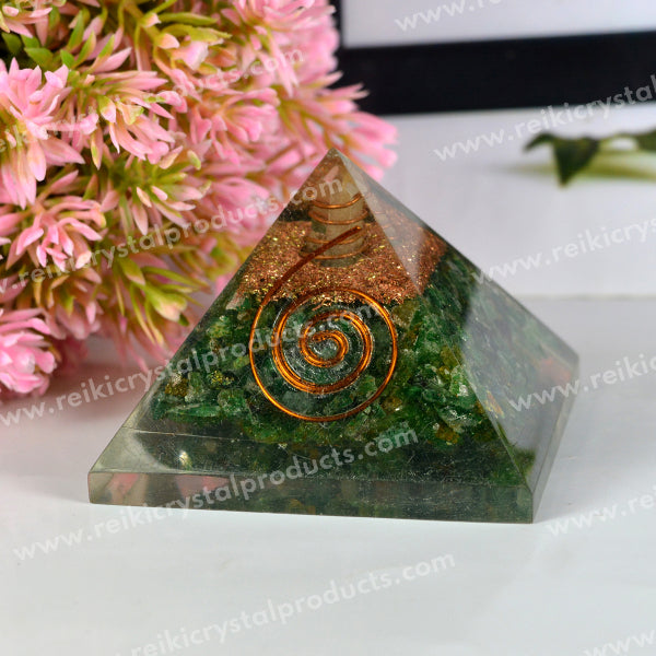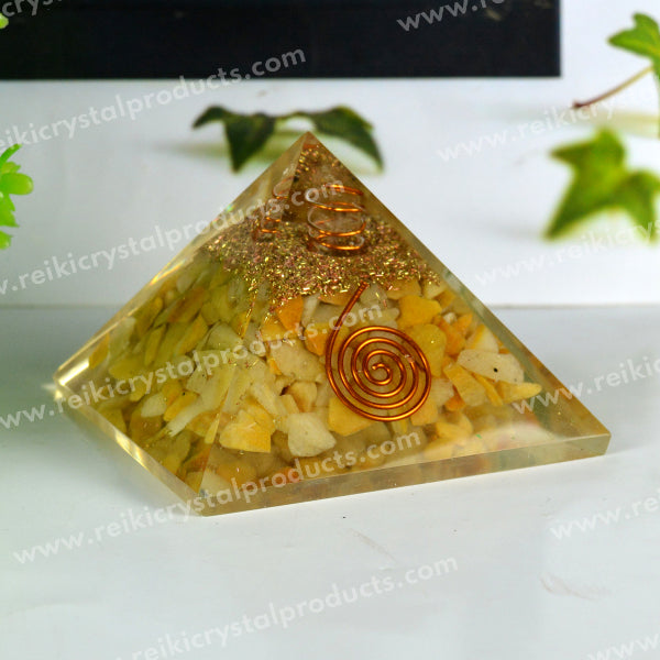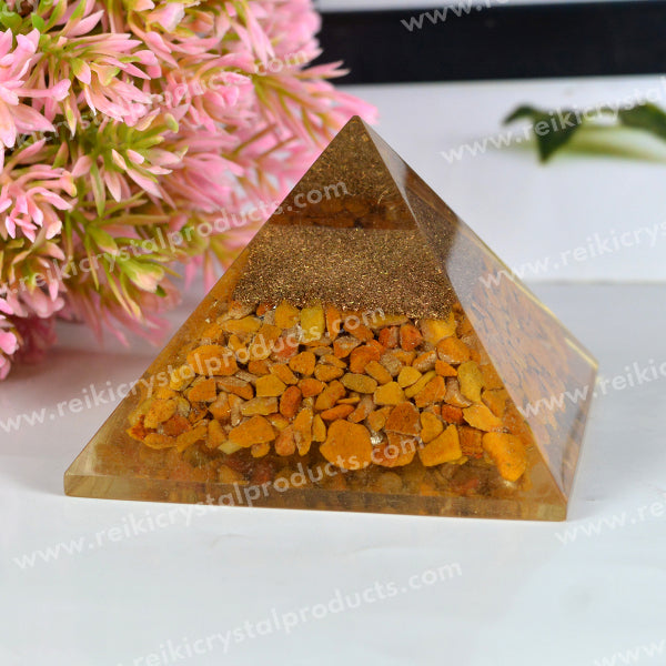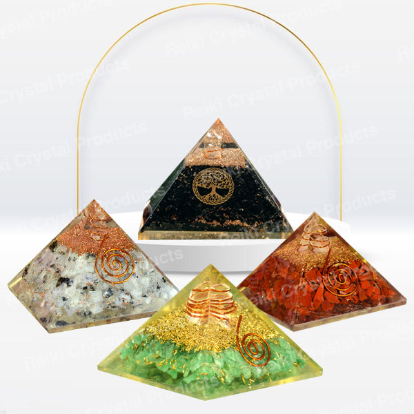 * Natural Orgone Pyramid Size 60 mm.* Energy Transformation: Crafted with a mix of resin, crystals, and metal shavings, the Orgone Pyramid is believed to convert negative energy into positive, fostering a more balanced and harmonious environment.* Sacred Geometry: The pyramid shape, a symbol of sacred geometry, amplifies the energetic properties of the orgonite materials within, creating a powerful focal point for meditation, spiritual practices, or simply as a decorative piece.* Energized by Experienced Reiki Grandmaster.* The pyramid is made from Natural Stones so small holes, crack marks on the surface or inside the stones are often visible.* Note: The crystal pyramid is a spiritual accessory, and its perceived impact is often rooted in personal belief and intention.