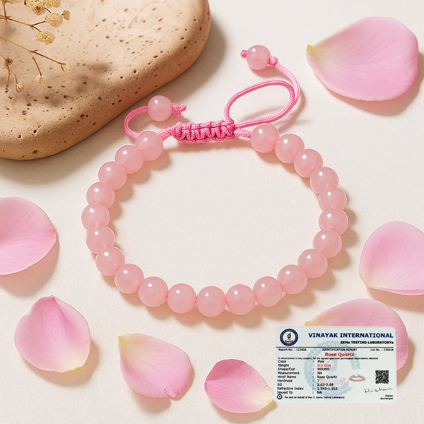 * Single Line Stone Macrame Nylon Cord Bracelet | Bead Size - 8 mm | Bead Shape - Round | Handmade Adjustable Bracelet * A rose quartz bracelet symbolizing love, compassion, and emotional healing. It is often worn to attract love, foster self-love, and promote harmony in relationships. The soft pink color adds a soothing and gentle energy to its wearer.* Energized by Experienced Reiki Grandmaster.* The necklace is made from Natural Stones so small holes, crack marks on the surface or inside the stones are often visible.