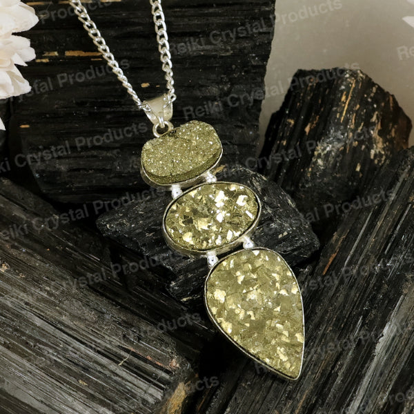 Pyrite Pendant—a magnificent formation of pyrite crystals renowned for their association with prosperity, abundance, and protective qualities.
